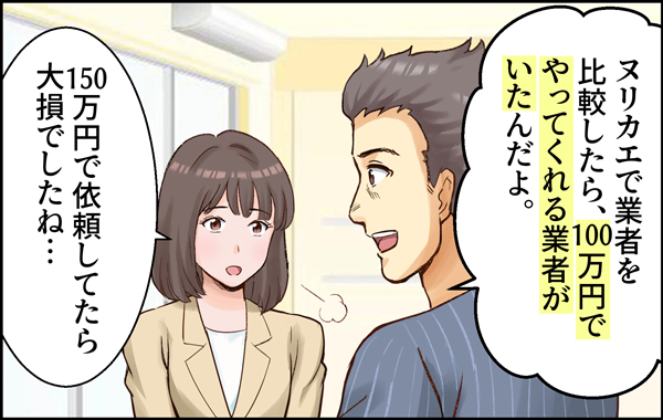 私の場合、助成金申請のサポートと優良業者の相見積もりを利用して、費用が70万円安くすみました。