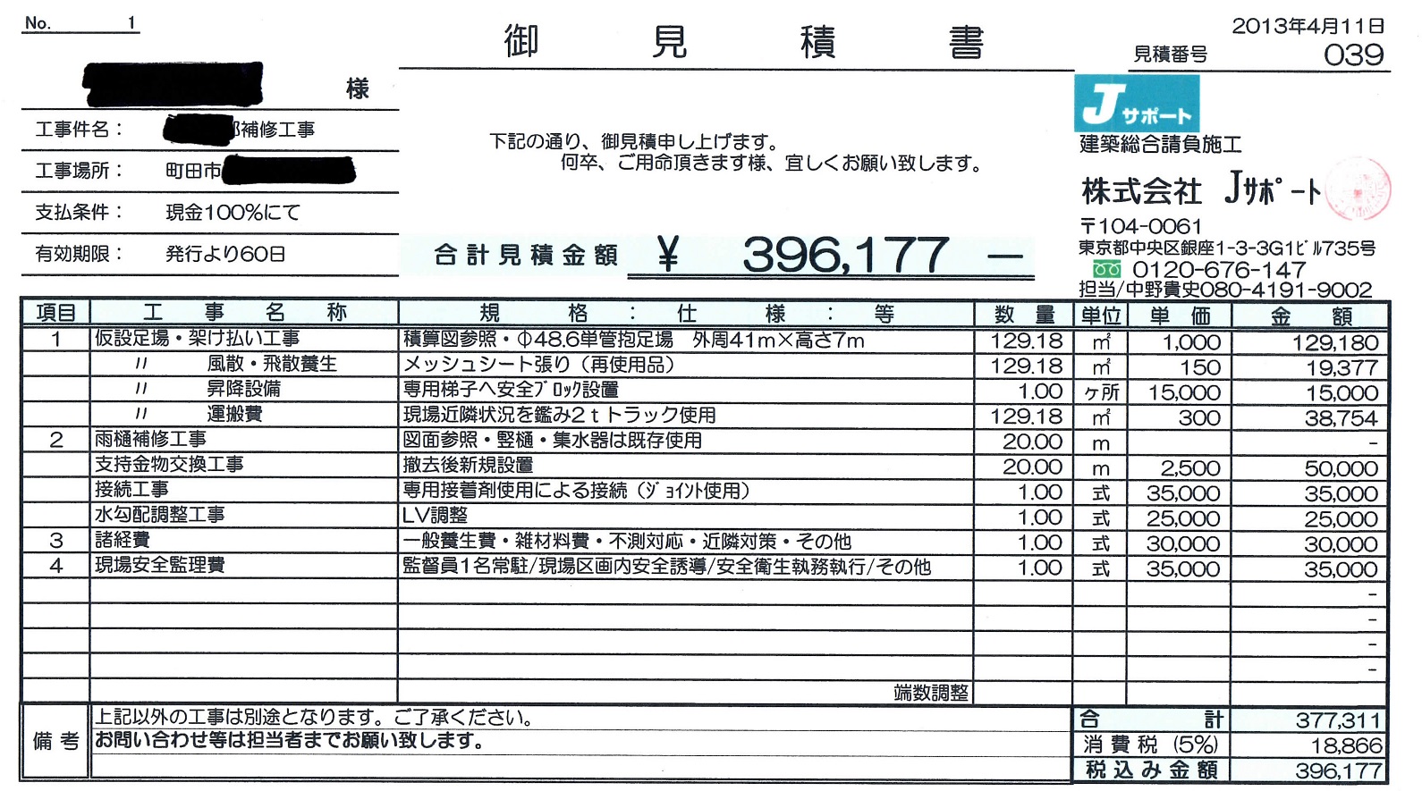 ドンブリ勘定的に適当な見積り金額が書かれていると思われます。また、雨漏りで困っていることに付け込んで、ワケのわからない項目が記載されている場合もありますのでご注意ください。